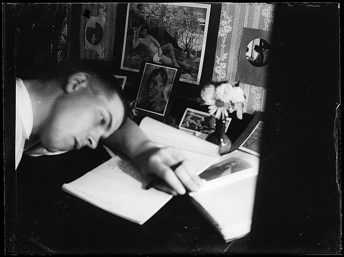 Dès ses premiers essais photographiques, Gustave Roud se prend régulièrement lui-même comme sujet. Le poète qui s'interroge sur l'inconsistance de sa propre personne se met volontiers en scène de manière très concertée : il s'entoure d'objets fétiches et familiers qui pourraient l’ancrer dans un réel vis-à-vis duquel il se sent en décalage. D'autres autoportraits jouent avec le reflet ou le miroir, insistant par là sur le caractère mouvant, incertain, et somme toute irréel de l'image de soi. Plus tard, Roud réalise des autoportraits en compagnie d'amis paysans, en particulier d'Olivier Cherpillod, à côté de qui il apparaît sur les photographies : mise en scène explicite du désir d'acquérir une épaisseur, fût-ce par la médiation d'une figure terrienne en quelque sorte vampirisée. Emblématiques de ce flottement identitaire, les innombrables autoportraits en creux où Roud fixe son ombre, au moment où il prend la photographie d'un de ses modèles : il exprime ainsi simultanément la force de son regard et la labilité de sa présence physique.